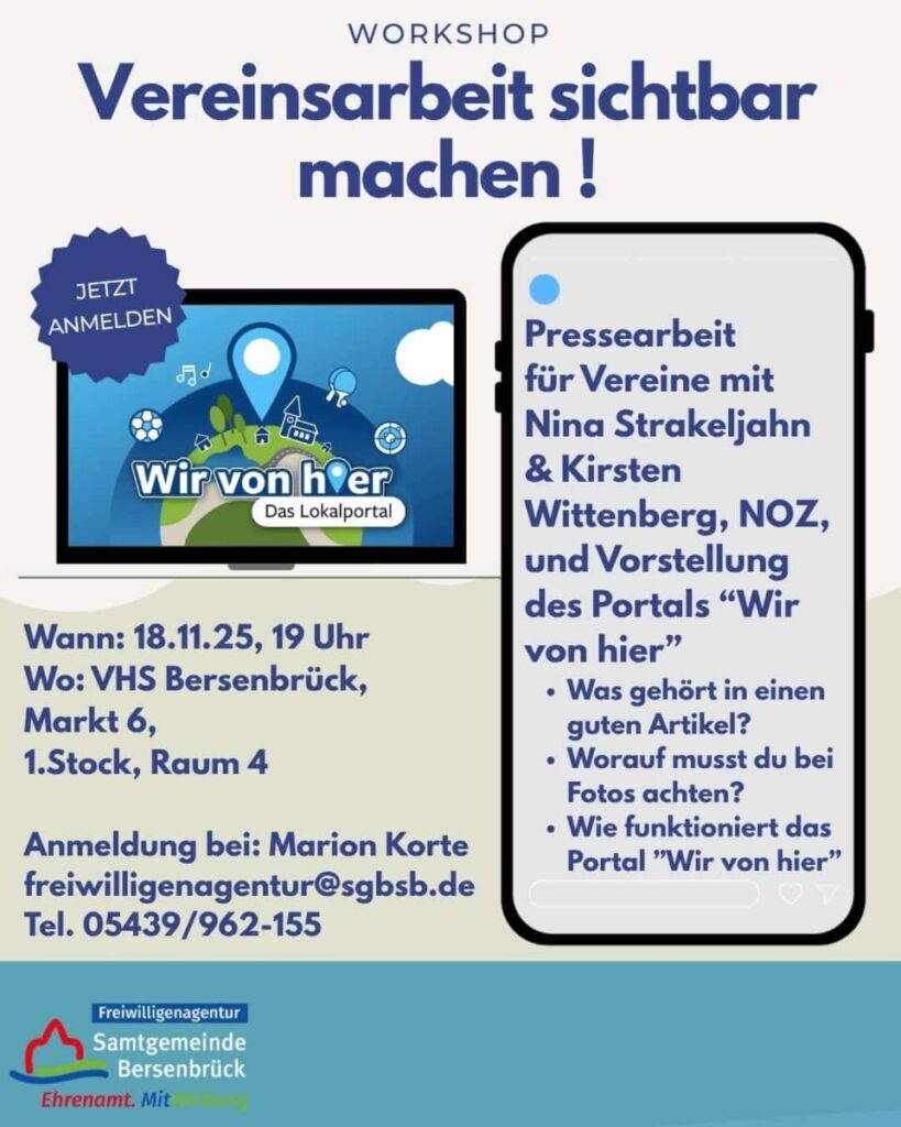 - Vereinsarbeit sichtbar machen! am 18.11. 2025 um 19 Uhr in der VHS Bersenbrück, Markt 6, 1. Stock, Raum 4.